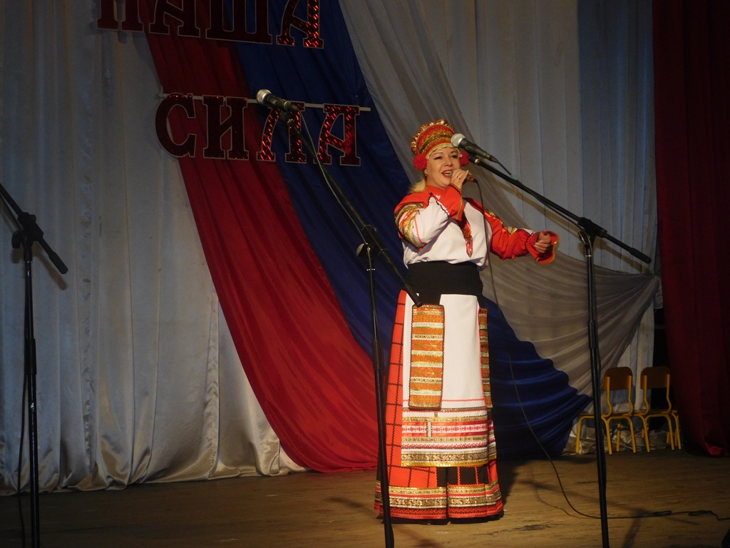 Открыла праздничную концертную программу солистка народного ансамбля «Меленица» Инга Шатрова с песней «Россия» Меленского сельского Дома культуры. Яркая и эмоциональная песня, заполненный до отказа зал и атмосфера праздника сделал этот вечер торжественным и запоминающимся.
