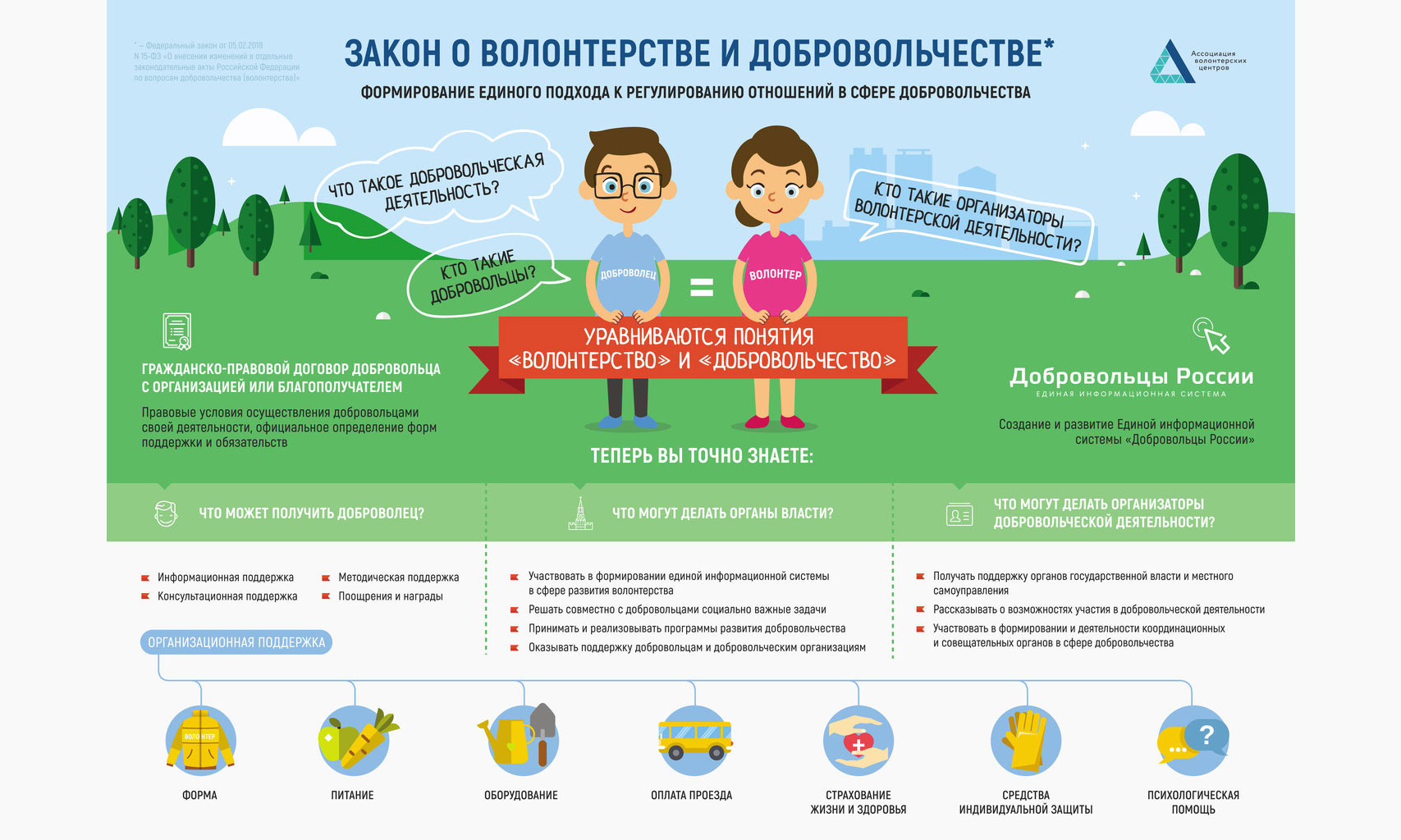 Федеральный закон «О добровольчестве (волонтерстве)» отвечает на ряд важных вопросов, в первую очередь, о статусе добровольца, его правах и обязанностях. Документ устанавливает такие понятия, как «волонтер» и «организатор волонтерской деятельности», таким образом, определяя субъекты, для которых можно будет вводить меры поддержки и создавать условия труда.