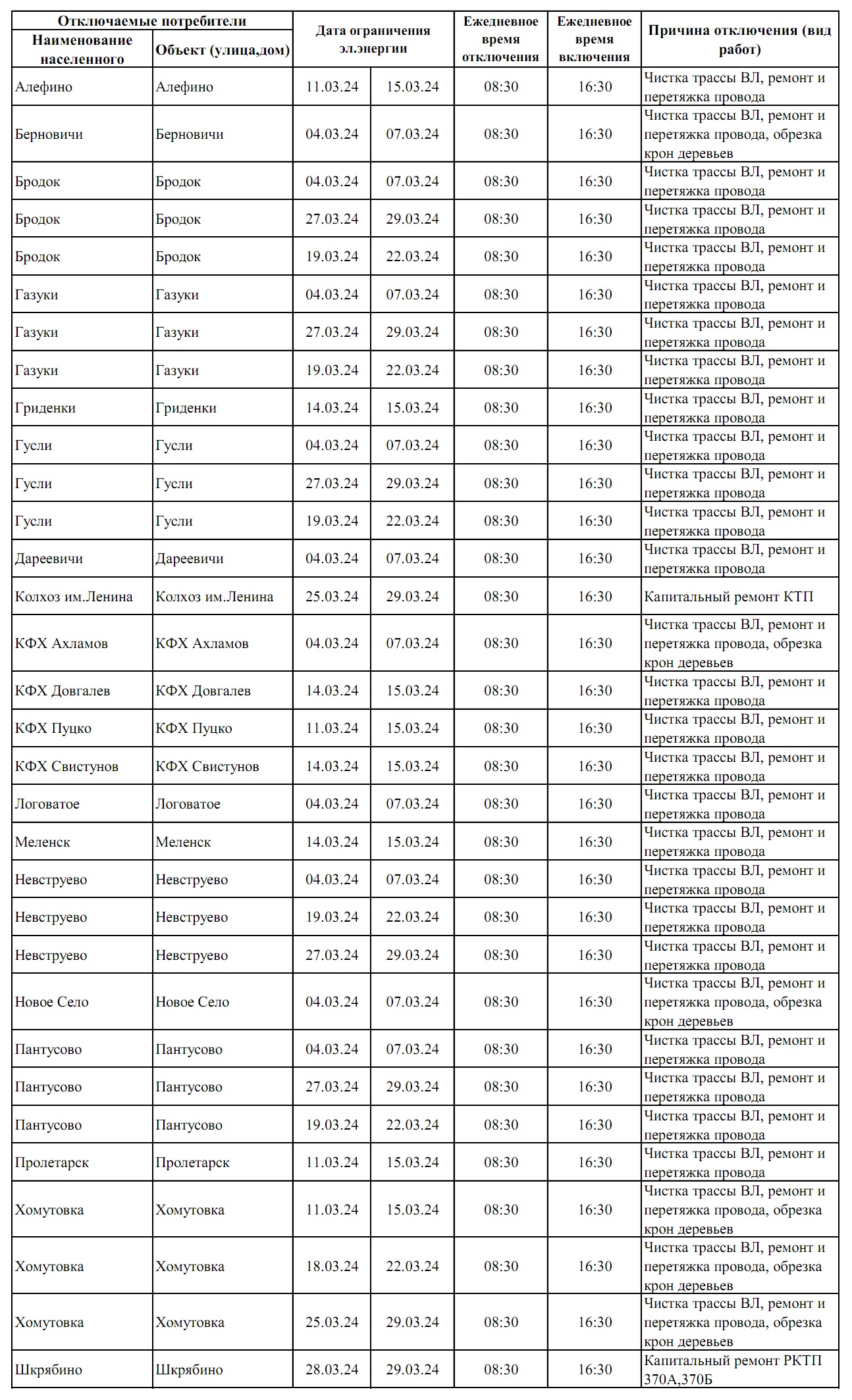 Филиал ПАО «Россети Центр»-«Брянскэнерго» в марте наметил кратковременное отключение энергетических объектов, обеспечивающих энергоснабжение ряда населенных пунктов. Энергетики приносят свои извинения жителям района за причиненные неудобства. Проводимые работы необходимы для повышения надежности функционирования сетевого хозяйства.